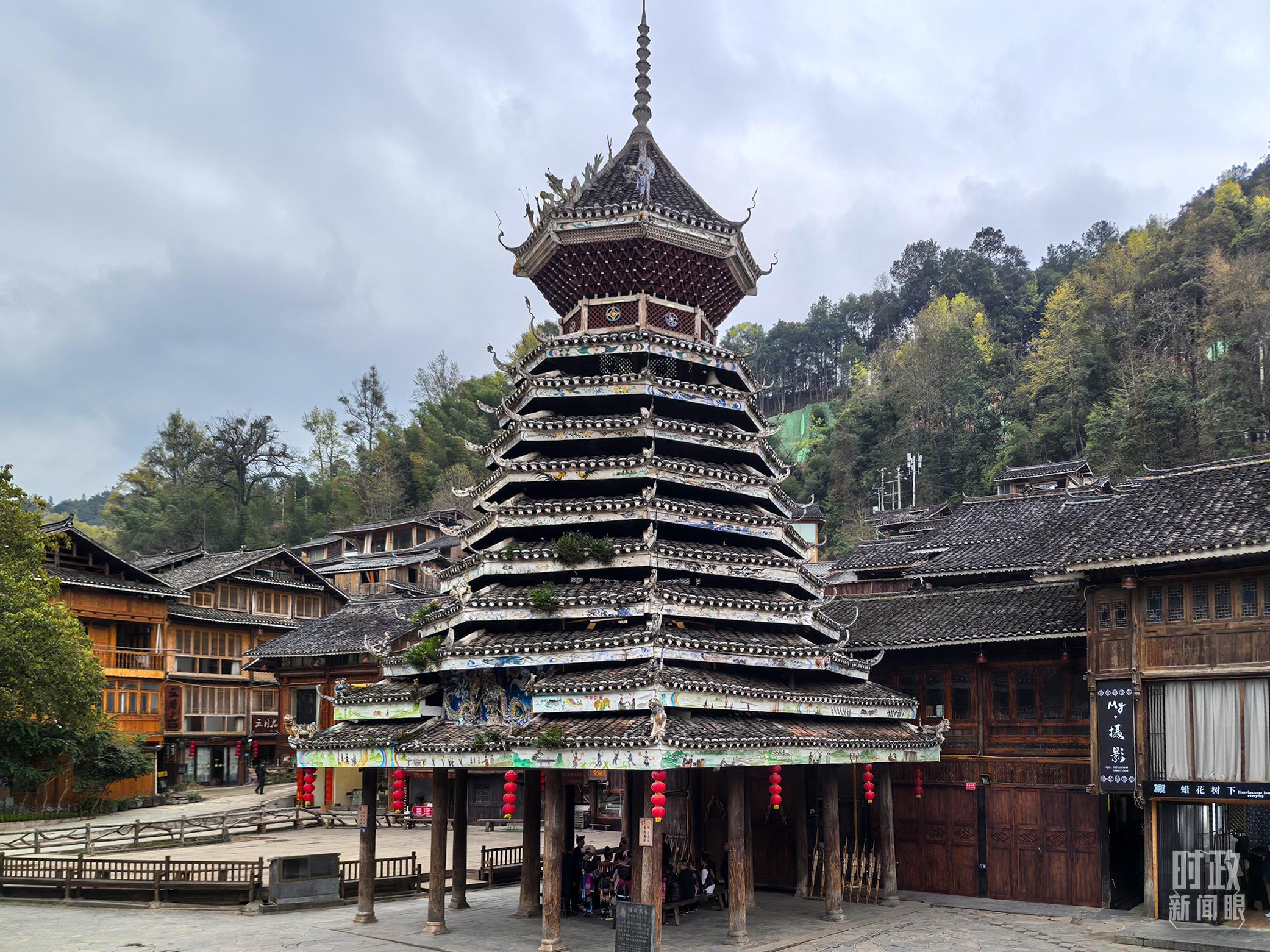 △肇興侗寨以鼓樓群最為著名,五座鼓樓分別取名“仁團鼓樓”“義團鼓樓”“禮團鼓樓”“智團鼓樓”“信團鼓樓”。圖中為信團鼓樓。(總臺央視記者陸泓宇拍攝)