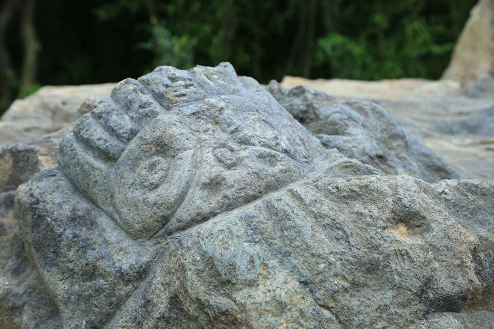 2015年,當(dāng)?shù)貙?duì)神農(nóng)部落旅游資源進(jìn)行調(diào)查時(shí),偶然發(fā)現(xiàn)了多處巖石上的凹穴。在桐柏山上竹林環(huán)繞的半山腰處,一塊巖石上赫然可見(jiàn)一處形似人面像的巖畫——“頭頂”約有10條線狀紋飾,組成“皇冠”的圖案;面部的圓環(huán)和圓點(diǎn),表示“雙眼”;下部5條射線狀紋飾,恰似“胡須”。這一長(zhǎng)20厘米、寬27厘米的人面像,是隨州發(fā)現(xiàn)的石器時(shí)期最為具象的巖畫,被當(dāng)?shù)厝朔Q為“太陽(yáng)神”,也有人稱他為“炎帝神農(nóng)像”。