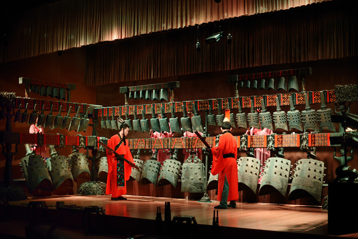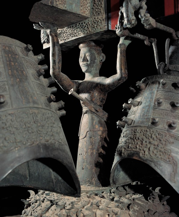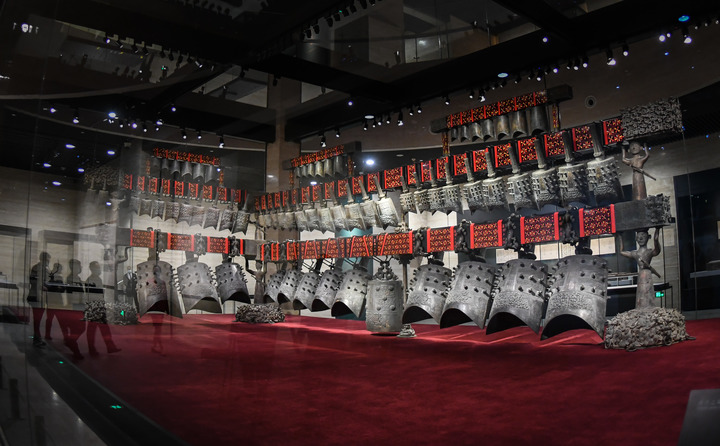 展廳正中,三層八組65件青銅編鐘的原件,巍然懸掛在曲尺形的銅木鐘架上。近5噸的重量全部由6個(gè)青銅佩劍武士立柱支撐,歷經(jīng)2400多年穩(wěn)如泰山。