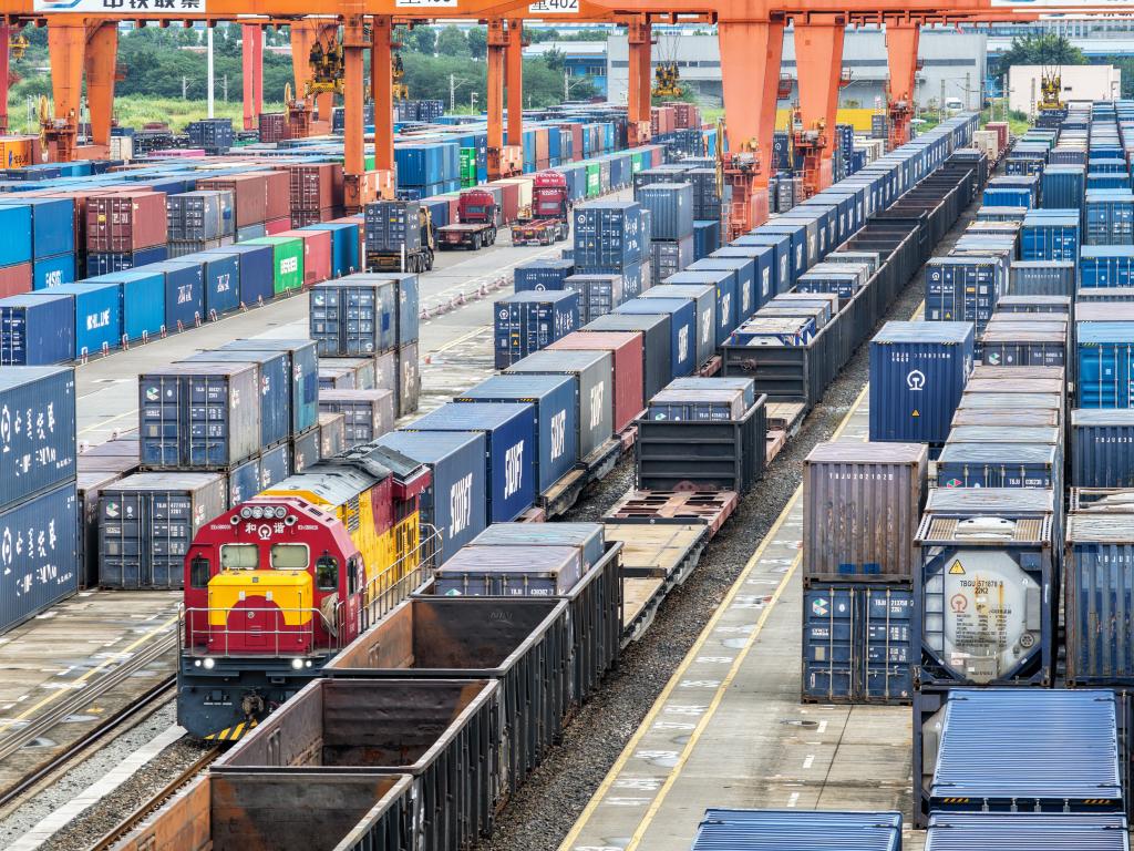 2025年9月8日,滿載“重慶造”汽車的中歐班列(成渝)在重慶團(tuán)結(jié)村中心站等待發(fā)車(無人機(jī)照片)。 新華社記者 唐奕 攝
