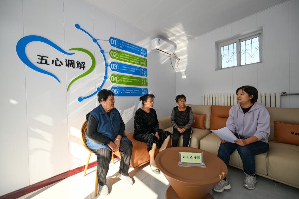 在天津市寧河區(qū)蘆臺街道金華路社區(qū),社區(qū)黨總支副書記吳蕊(右一)就社區(qū)監(jiān)控設(shè)備安裝問題為社區(qū)居民進(jìn)行解答(2024年10月11日攝)。金華路社區(qū)積極踐行新時(shí)代“楓橋經(jīng)驗(yàn)”,將原社區(qū)居委會閑置用地提升改造成為聯(lián)絡(luò)群眾的基層綜合治理陣地——“解鈴小院”。 新華社記者 孫凡越 攝