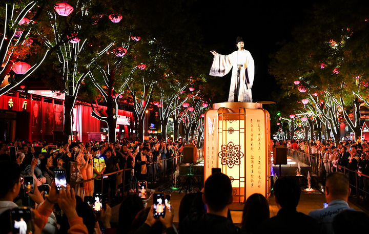 華燈初上,大唐不夜城一處高臺(tái)上,詩(shī)仙“李白”凌空而立,與數(shù)百名游客齊誦《蜀道難》,蔚為壯觀。