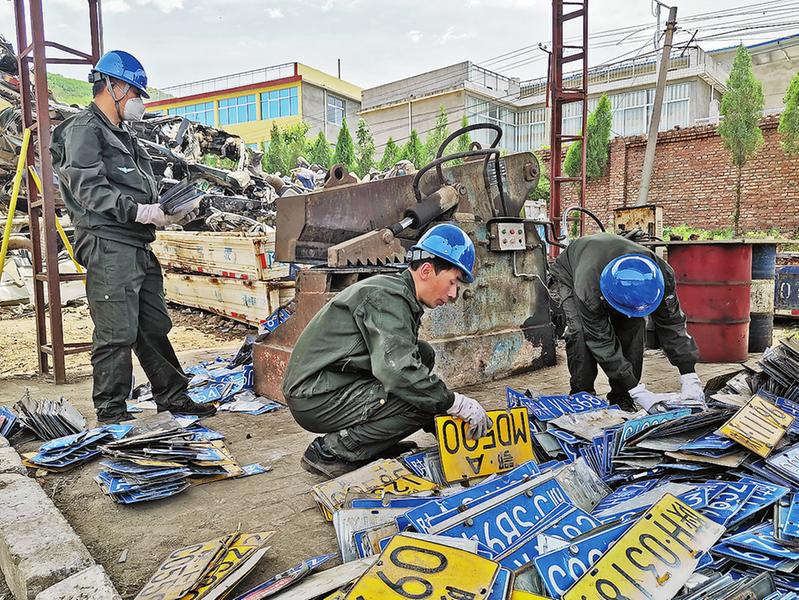 5月26日,市交警支隊車管所在商洛市磊寶報廢汽車回收拆解有限責任公司開展機動車號牌集中銷毀活動,對2019年辦理轉移登記號牌、殘損號牌、辦理注銷業(yè)務回收的廢舊號牌以及路面秩序查扣的假牌套牌等車牌進行逐塊切割、解體銷毀,共銷毀廢舊號牌1.2萬面。(宋雨萌攝)