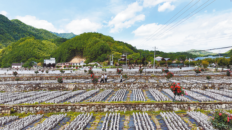 △9月6日,柞水縣下梁鎮老庵寺村木耳種植基地與藍天白云相映成趣,一排排菌棒整齊排列,勾勒出一幅生機盎然的田園畫卷。