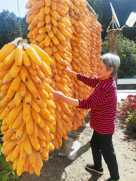 △9月13日,秋陽正好,商州區楊斜鎮松云社區的居民紛紛在自家院中晾曬玉米,金黃的玉米裝點庭院,盡顯豐收好光景。