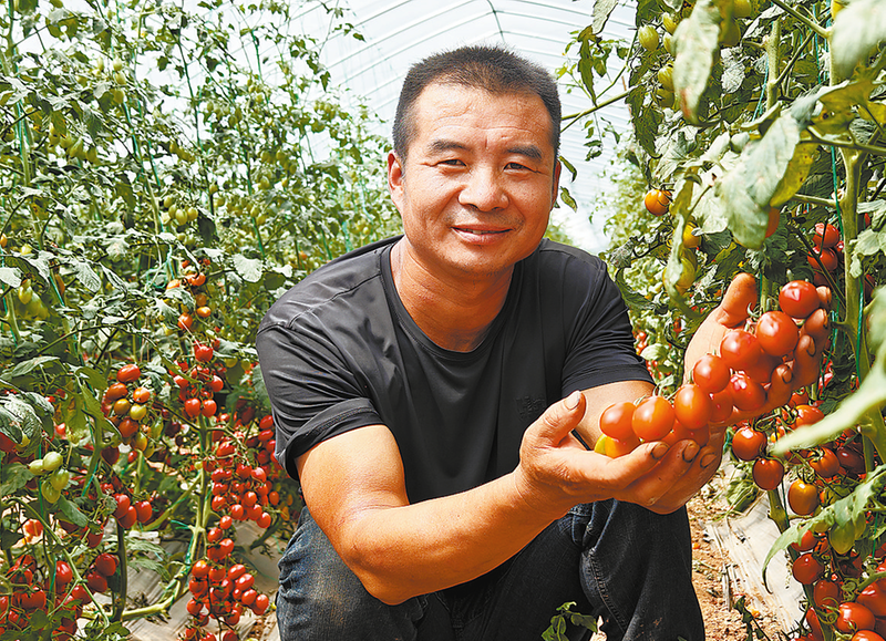 △9月16日,洛南縣四皓街道連河村瓜果種植采摘基地內,圣女果藤蔓上綴滿了果實,技術員羅鵬在查看圣女果長勢。