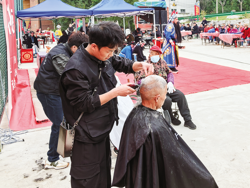 10月22日,由商州區文旅局主辦、區文工團承辦的“九九重陽·情暖夕陽”暨文化惠民演出活動在大趙峪街道蘆河澗村舉行?;顒油ㄟ^文藝表演與志愿服務相結合的形式,弘揚了尊老敬老愛老的傳統美德。圖為志愿者為老人理發。 (本報記者 方 方 攝)