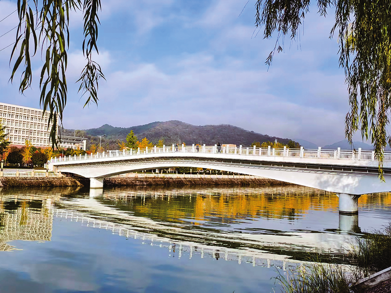 △在市區(qū)丹江公園,碧藍(lán)而高遠(yuǎn)的天空、白色的橋和金色的銀杏葉倒映在清澈的河水中,如同一幅秋日油畫。 ?市區(qū)濱江銀杏公園內(nèi),市民在高大的銀杏樹(shù)間散步,盡顯秋日的愜意。