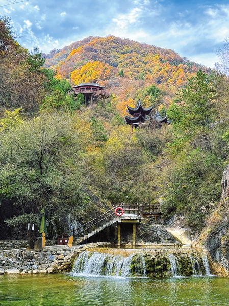 ?在秦嶺江山景區(qū),飛檐翹角的亭子掩映在碧水、藍(lán)天和斑斕的山色中,共同構(gòu)成了一幅秋日盛景。