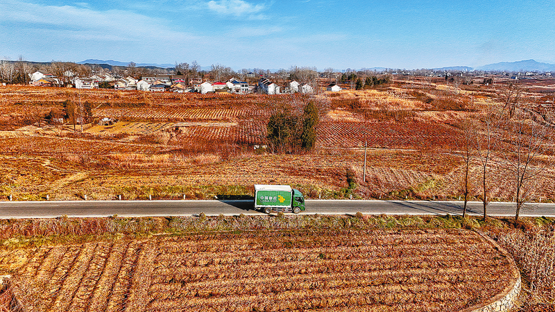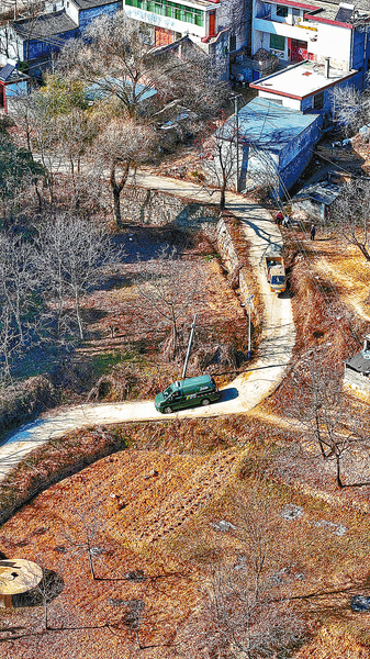 △彎彎的郵路連通城鄉(xiāng),郵車進村入戶將快遞和幸福一并送到千家萬戶。圖為一輛郵車行駛在洛南縣景村鎮(zhèn)的村道上。