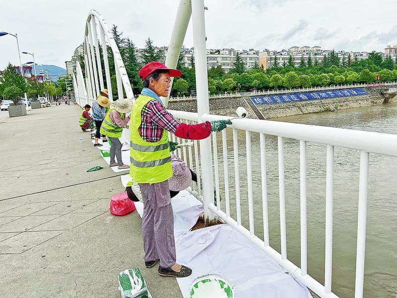 為進一步美化城市環境,做好十四運會準備工作,7月18日,施工人員對市區彩虹橋圍欄刷漆翻新。 (記者王孝竹攝)