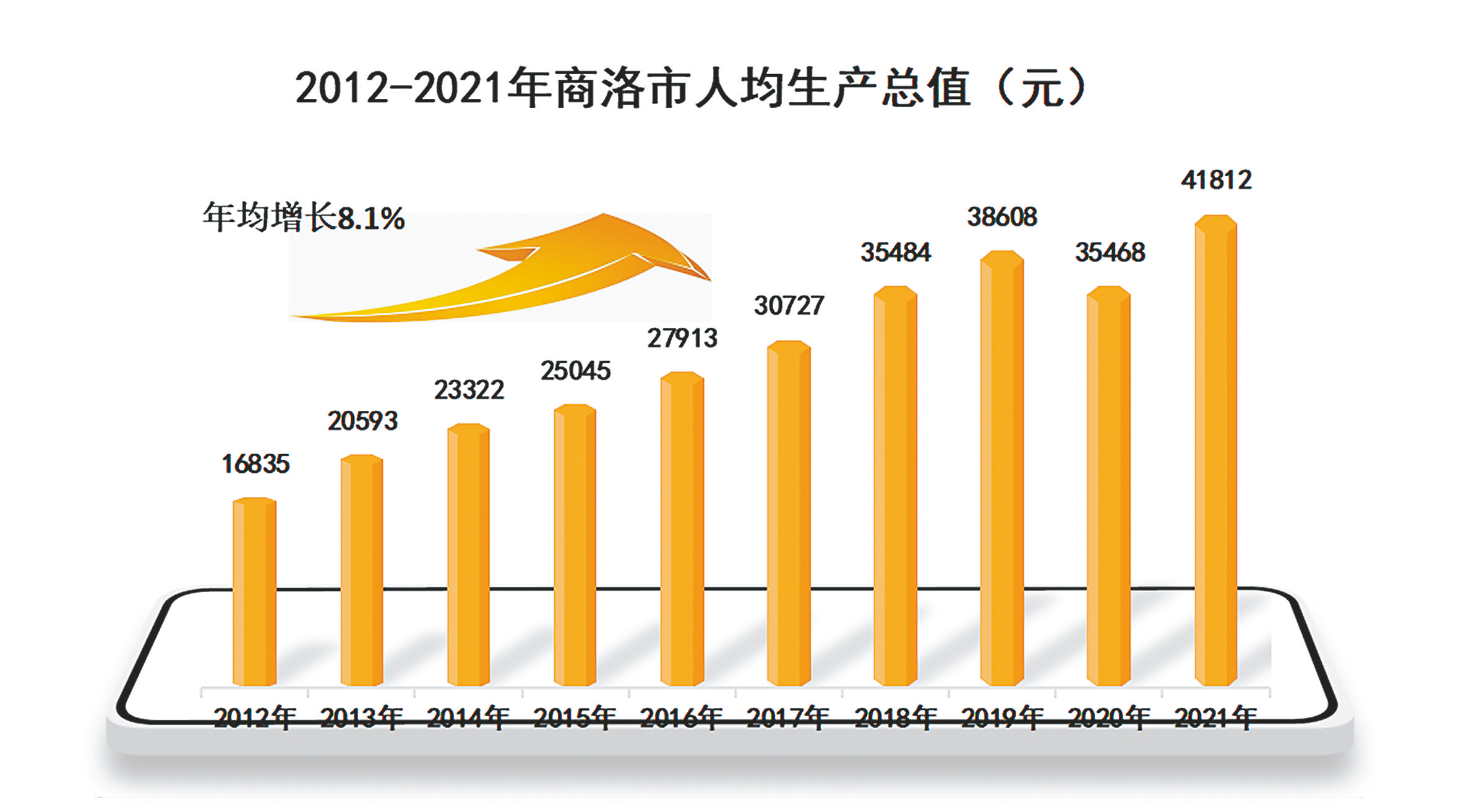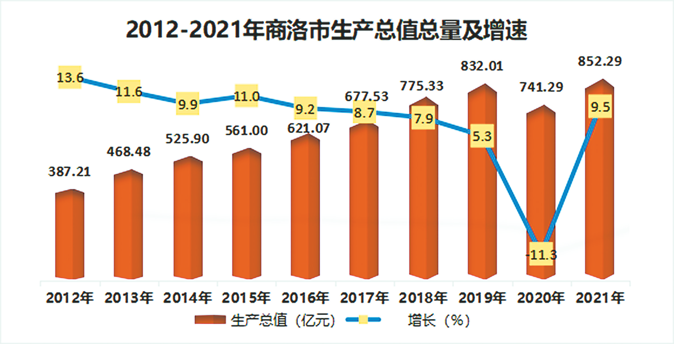 經濟總量持續增長。黨的十八大以來,我市經濟總量相繼邁上了一個又一個新臺階,實現了突破式發展。2012年,我市經濟總量為387.21億元,一二三產實現增加值分別為77.7億元、150.81億元、158.63億元;2021年,商洛經濟總量達到852.29億元,是2012年的2.2倍,一二三產實現增加值分別118.50億元、339.77億元、394.02億元,分別是2012年的1.5倍、2.3倍、2.5倍。