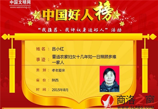 商洛之窗訊(丹南)8月31日,商南普通農婦呂小紅榮登8月"中國好人榜",被評為孝老愛親類中國好人。