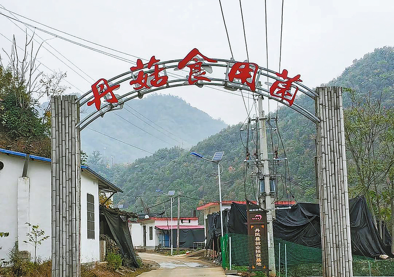 從蔣家莊跨過(guò)一道斜碥,進(jìn)入丹鳳境內(nèi),來(lái)到梅莊村,映入眼簾的是“丹菇食用菌”產(chǎn)業(yè)基地的拱門。