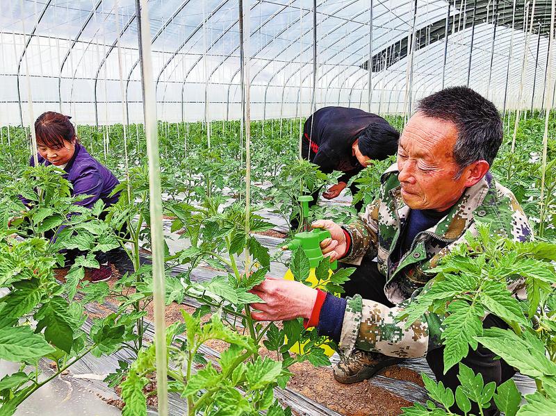 “這大棚是恒溫模式,所以需要人工授粉。”在棚內(nèi)務(wù)工的村民對記者說。他小心翼翼地一手托起西紅柿苗新長出的淡黃色花朵,一手拿著噴壺輕輕對著花授粉,一旁的駐村第一書記孫正濤不時提醒他授粉的要點。