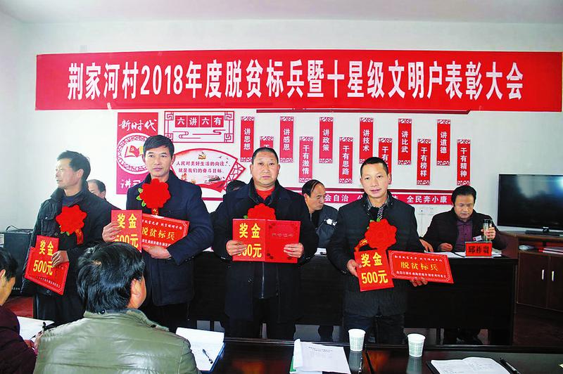 去年以來,在學(xué)習(xí)宣傳中、省、市和縣鎮(zhèn)先進(jìn)典型的同時,我們高度重視身邊先進(jìn)典型的培養(yǎng)、指導(dǎo)、挖掘和宣傳工作,僅2018年就在全村107戶貧困戶中打造出4個脫貧標(biāo)兵。一是黨員脫貧帶貧標(biāo)兵何衍杉。作為一名退伍回村黨員,他2014年被識別為貧困戶,在包扶干部幫助下依靠發(fā)展藥材種植,2017年就脫了貧,脫貧后他不忘黨恩,成立“寶豐中藥材專業(yè)種植合作社”,吸納17戶群眾種植藥材,幫帶7戶貧困戶陸續(xù)脫貧,受到了商南縣領(lǐng)導(dǎo)的夸獎。二是自強(qiáng)自立的獨臂漢子汪仁喜。他16歲時不慎失去右臂,2017年被識別為貧困戶,但他依靠黨的扶貧政策開電磨坊、養(yǎng)豬、種香菇,2018年底徹底脫貧,在商南縣脫貧誓師大會上受到表彰獎勵,被譽(yù)為“立志脫貧標(biāo)兵”的榜樣。三是申請摘帽標(biāo)兵甘齊成。他因住房和女兒上大學(xué)2016年被識別為貧困戶,在干部幫扶和政策扶持下,通過釀造高粱酒和養(yǎng)殖土蜂蜜,兩年就脫貧致富了。2018年9月,他主動遞交申請要求退出貧困戶,不再享受扶貧政策。四是替黨分憂回報社會的楊培斌。他2015年被識別為貧困戶,通過參加村實用技術(shù)培訓(xùn),利用產(chǎn)業(yè)幫扶資金和貼息貸款發(fā)展養(yǎng)豬、養(yǎng)羊和制作臘肉等,于2017年脫貧摘帽。脫貧后的楊培斌成立合作社幫帶5戶貧困戶也脫了貧,且向村支部遞交了入黨申請書,要求入黨替黨分憂,被樹為“脫貧致富心向黨、摘帽爭當(dāng)積極分子”標(biāo)兵。