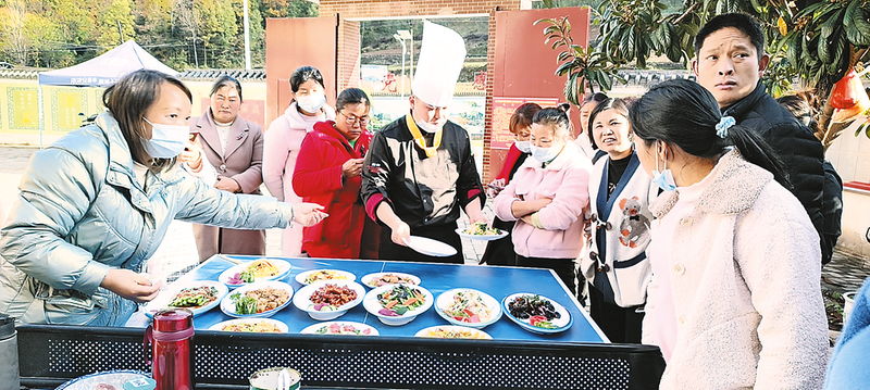 ①村民正在喂羊②村民在蒼術種植基地內除草③蛋雞養殖基地內工人正在喂雞④毛起建正在查看蜜蜂生長情況⑤后坪村村民正在進行廚師技能大賽