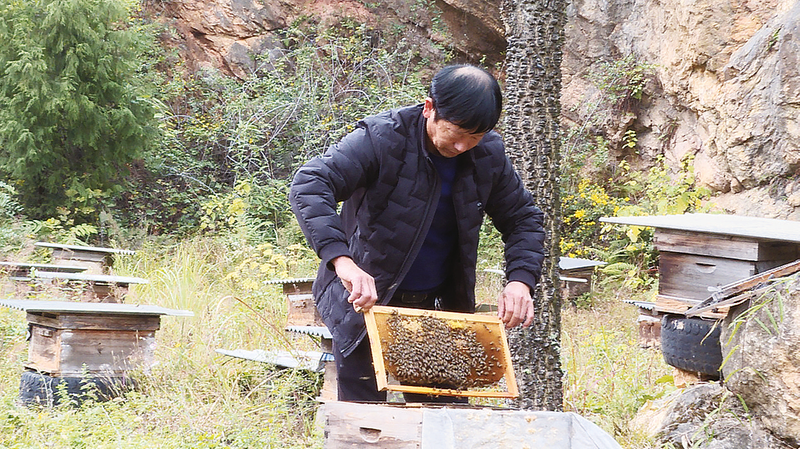 12月5日,在商南縣湘河鎮后坪村蜜蜂養殖基地,養蜂人張振峰正在忙著檢查每一箱蜜蜂的成長和產蜜狀況。一排排蜂箱在樹林下整齊排列,如一棟棟精致的“小別墅”,蜜蜂們通過蜂箱的小孔飛進飛出,為初冬的大地增添幾分生機與活力。