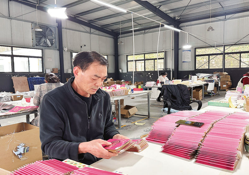 ?青山鎮社區工廠帶動100多人穩定就業。圖為工人李陸林整理賀卡。