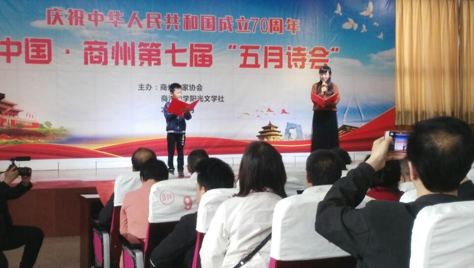 詩會活動簡潔明快,直奔主題。十多位詩詞愛好者紛紛登臺,分別朗誦了《祖國啊,我親愛的祖國》《信念》《一個村子的戰役》《和一座城談一場曠世的戀愛》《那年花開》《《在商州,是幸福的》《祝福五月》等膾炙人口的原創作品,一群身著漢服的中學生朗誦了詩文《商山賦》。一位年輕女士和一個八、九歲的男孩朗誦的《中華少年》,將整個詩會推向了高潮。