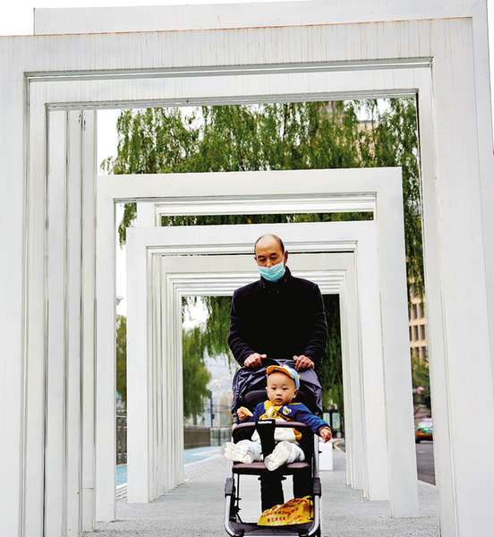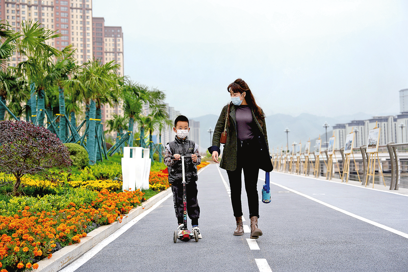 市民帶孩子在一處休閑長(zhǎng)廊散步