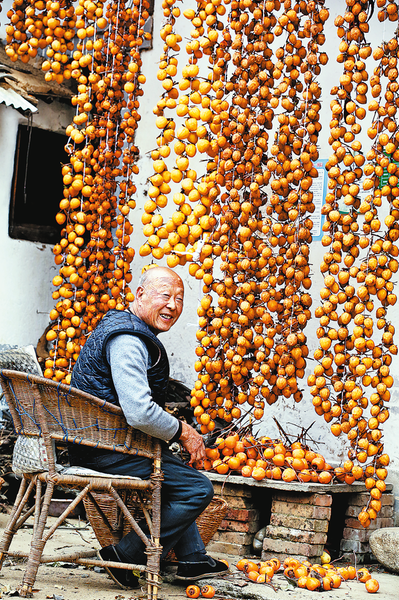 這些被村民高高掛起來進行晾曬的柿子,每個都已經被去了皮,將被制作成柿餅。去皮就是用傳統的手工去皮刀,將七八成熟的柿子表面削除。據村民介紹,柿子光滑的表皮具有一定的澀味,削除表層后通過晾曬、上霜,柿子更加甘甜可口、有韌性。