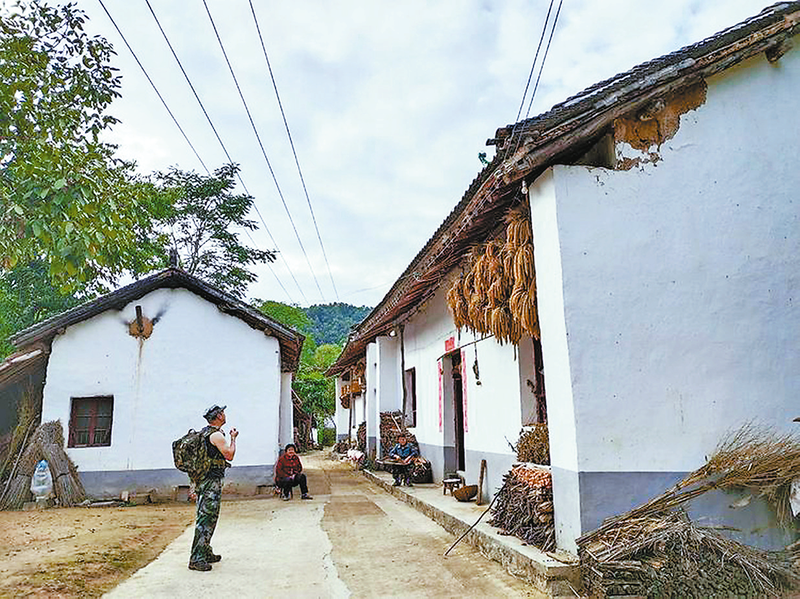 穿過一片高大的樹林,走進莊子里,路邊辣椒、青菜、小蔥水靈靈的,紅艷艷的柿子掛在枝頭。莊子分布在山脊之上,清一色的白墻灰瓦,兩座房子中間加一條巷子,有點像小街道,家家房檐下掛著蜂箱。幾位婦女坐在門前做家務(wù)活,看見生人來臨,臉上寫滿慈祥。聽當(dāng)?shù)厝苏f,郭溝嶺上有郭家和任家兩大姓,祖先來到這里有上百年了,目前大部分年輕人搬往山下或城里,但郭溝嶺上土地肥沃、物產(chǎn)豐富,老年人都舍不得離開。