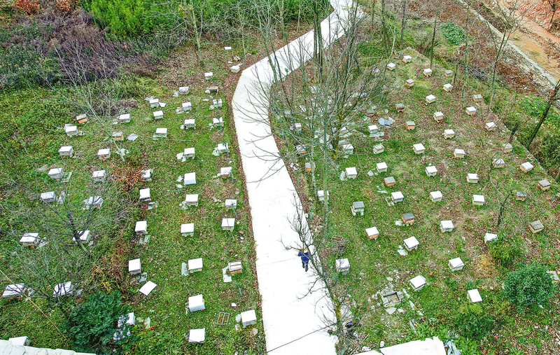 初冬,養蜂人家門前整齊排列的蜂箱成了村子一道獨特的風景線。