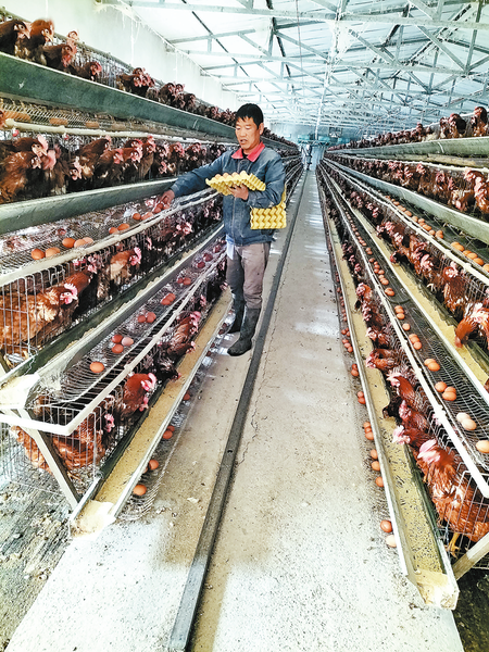 蛋雞產(chǎn)蛋期對蛋白質(zhì)要求高,寇亞平經(jīng)過多年觀察,最終確定了以玉米為主、配以精料的飼料,這樣讓蛋雞既能吃飽,又有足夠的蛋白質(zhì)。到了產(chǎn)蛋期,寇亞平整天都待在雞舍里撿雞蛋,最多時一天能收500多公斤雞蛋,他常常忙得腰酸背疼。