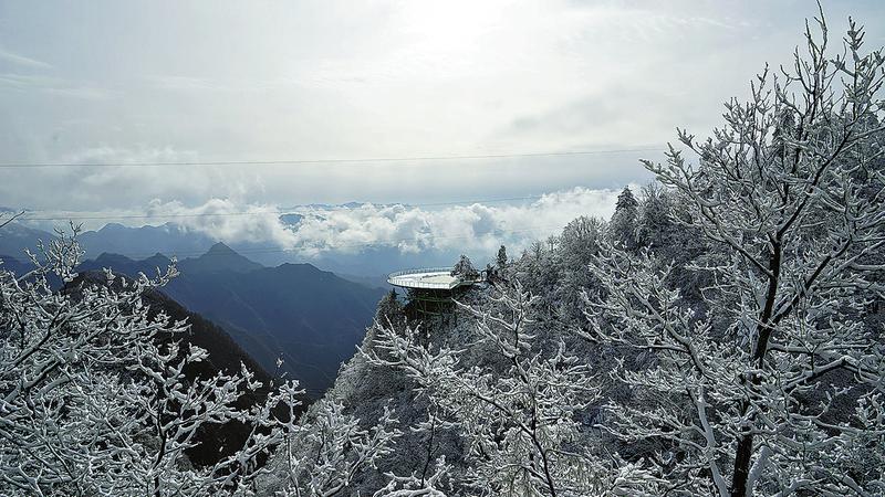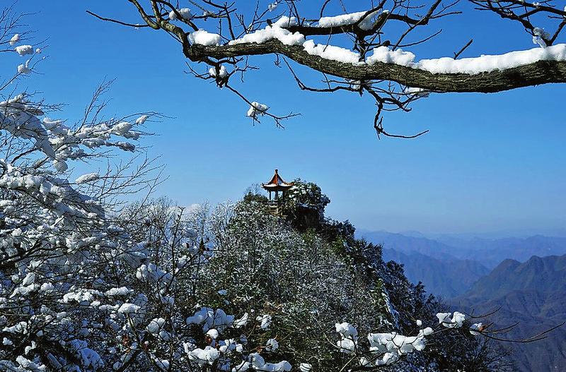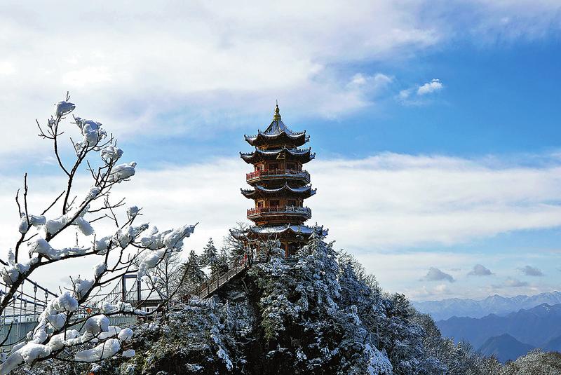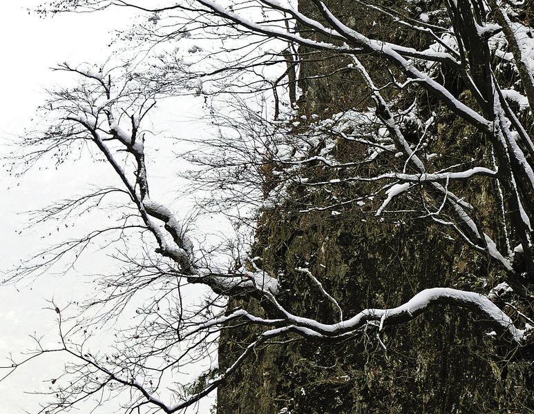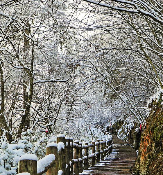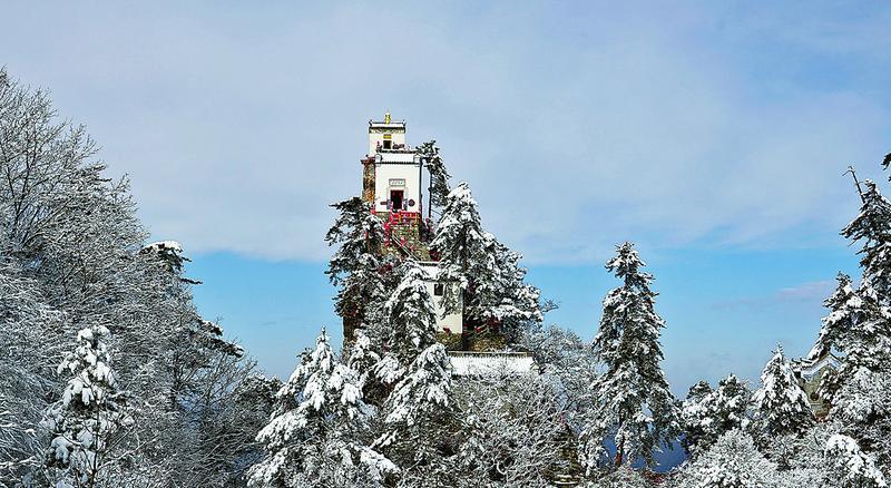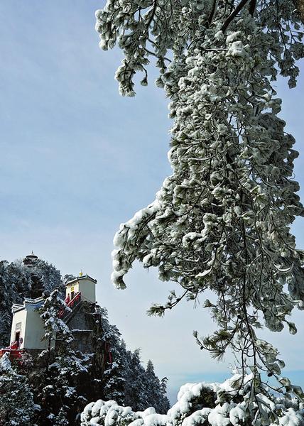塔云山海拔1600多米,氣溫低,每當(dāng)山下冬雨紛紛時(shí),這里已是雪花飄飄,銀裝素裹。山上植被高達(dá)95%以上,到處是蒼松翠柏,使這里形成了千奇百怪的霧凇景觀。那落葉的樹枝突然變得肥胖,一棵樹就是一盆珊瑚奇景;那些沒有落葉的喬木、灌木,在冬雪的裝扮下開出棉花般的大團(tuán)花朵;那歷經(jīng)五百多年的道觀,被白雪悄然覆蓋,變得更加圣潔靜謐。在這潔白的世界里,塔云山的每一處景觀、每一個(gè)建筑,都是一幅水墨畫,讓人過目難忘。