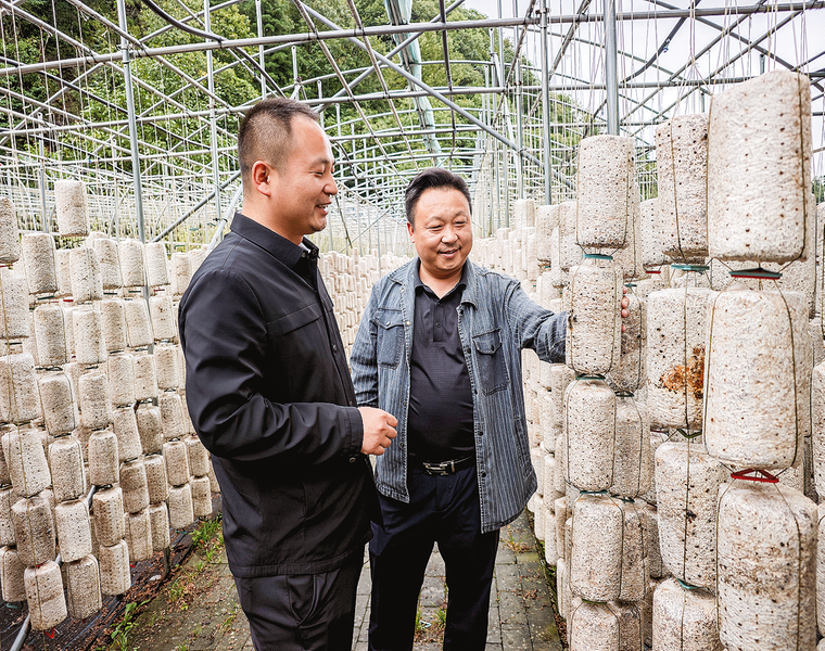9月19日,西華村黨支部書記石立柱(右)在木耳基地查看木耳生長情況。