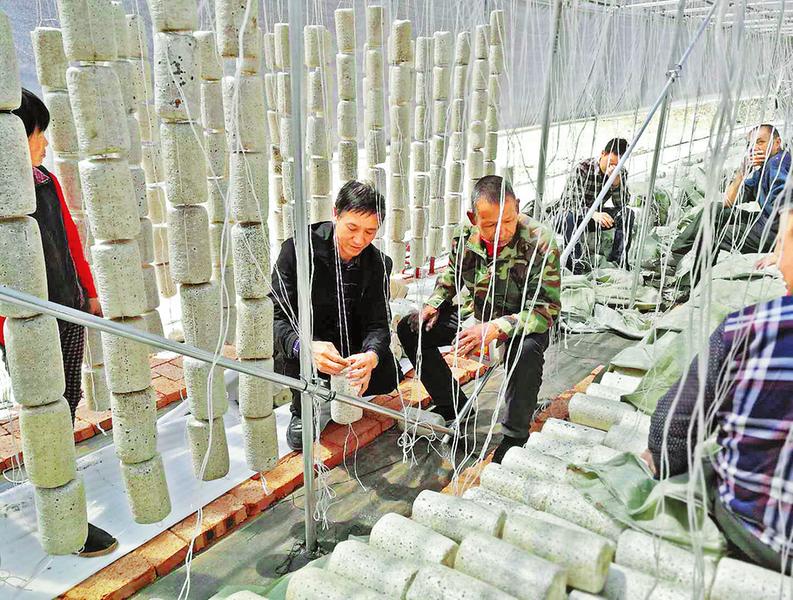 由村兩委利用產業資金委托集體經濟組織建設大棚,統一采購菌袋,按照一戶貧困戶承包一個大棚、掛袋2萬袋左右的標準,先期借給貧困戶進行種植,大棚及設施設備安全由各戶負責。村集體經濟組織為貧困戶提供技術指導、生產設施設備、互助資金支持,村委會協助辦理貼息貸款。曹坪鎮在柞水縣產業辦的支持下,聘請東北專業技術指導員,在基地直接給老百姓傳授種植管理技術。由村集體建吊袋大棚,購置打孔機,建好噴灌設施,配齊吊繩掛扣、保溫膜,村委會協助缺資金的種植戶申請農戶貸和互助資金,解決其資金困難。
